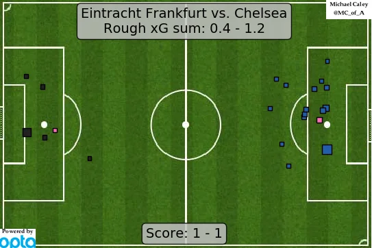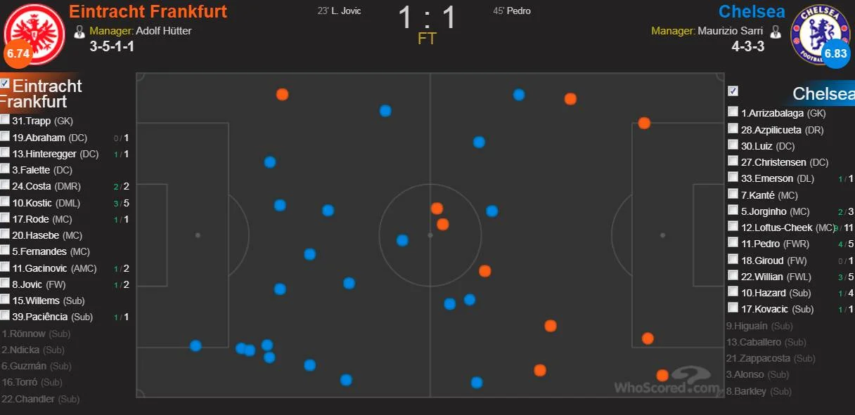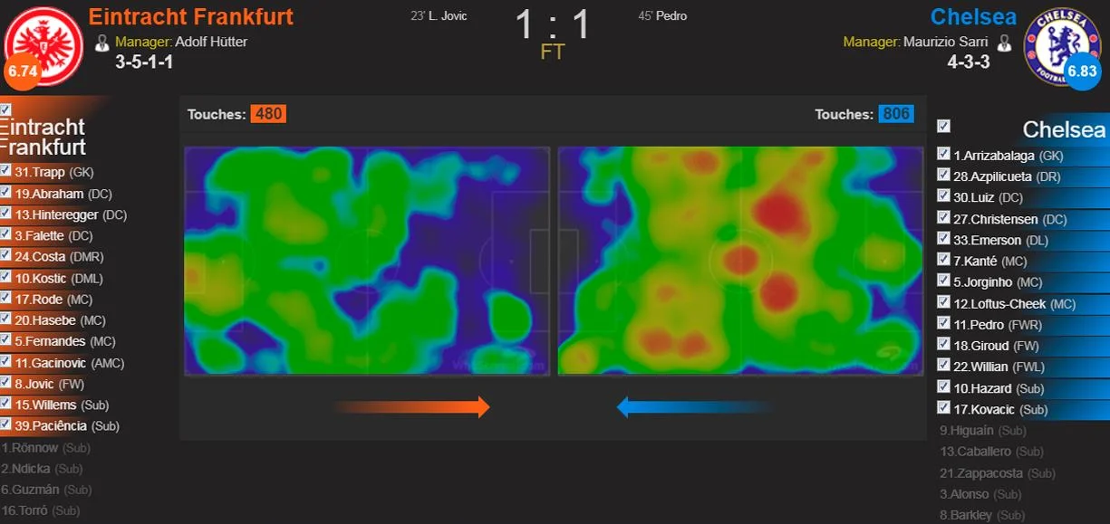 Врівноважити ситуацію могла б якісна контратакувальна гра, однак Айнтрахт в ній виглядав відверто примітивно. За весь матч у німців пройшла всього одна цікава комбінація, а зі скромних п'яти незаблокованих ударів по воротах три пройшли у проміжку з 16-ї по 23-у хвилину й ще два сталися на 84-й. Височенний клас Костіча та Йовіча дозволив перетворити банальний простріл у гол, однак в цілому нападники була відірвані від своєї команди. Челсі домінував у центрі поля, внаслыдок чого точність передач виявилась вкрай низькою – всього 62%. Ось так виглядала теплова карта зустрічі: