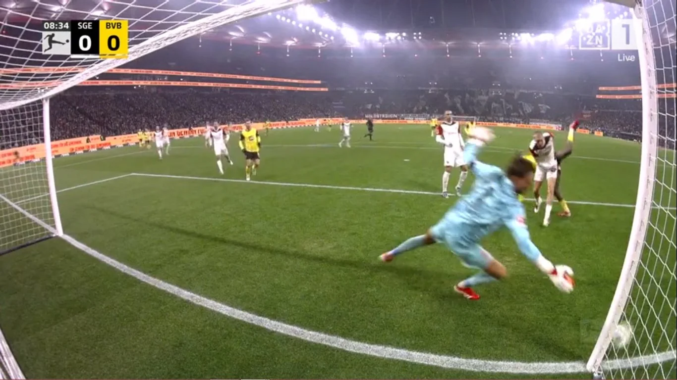 Втім, краще від цього не стало. Як і в поєдинку з Леверкузеном, дортмундці могли пропускати вже на 1-й хвилині – і знову внаслідок помилки на стадії білд-апу, під пресингом суперника. Кобель обрізався, а "орли" одразу ж вивели Ларсона віч-на-віч під кутом. Кобель врятував Борусію, парирувавши ногою.