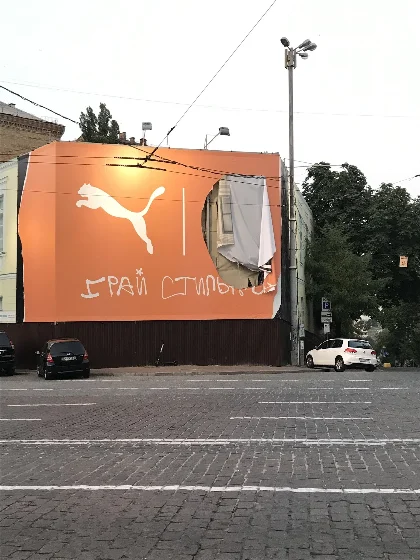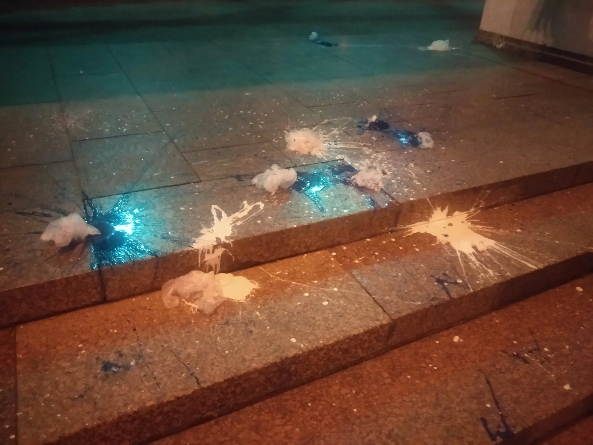 На зображеннях видно, що логотип "гірників" вирізаний з полотна, а от спонсор Puma залишився недоторканним. Окрім цього, банери, розвішені на Українському домі, були закидані білою та синьою фарбами.