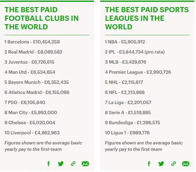 Рейтинг впевнено очолює каталонська Барселона. "Кулес" стали першою командою в історії спорту, де середня зарплата склала більше 10 млн фунтів у рік.