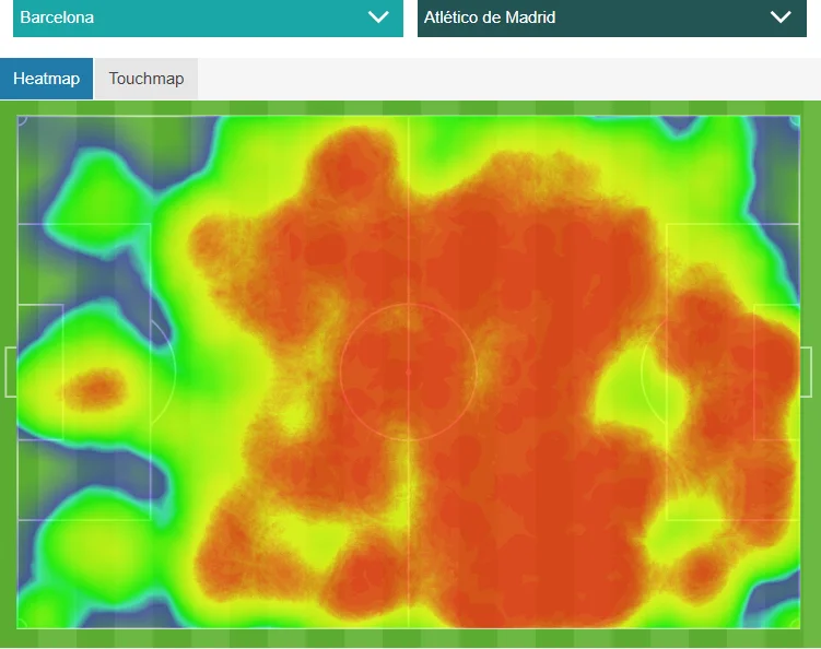 Теплова карта до 75-ї хвилини матчу. Рідко коли у топ-матчах доводиться бачити таку велику червону пляму в штрафному – тим паче, коли це штрафний Атлетіко.