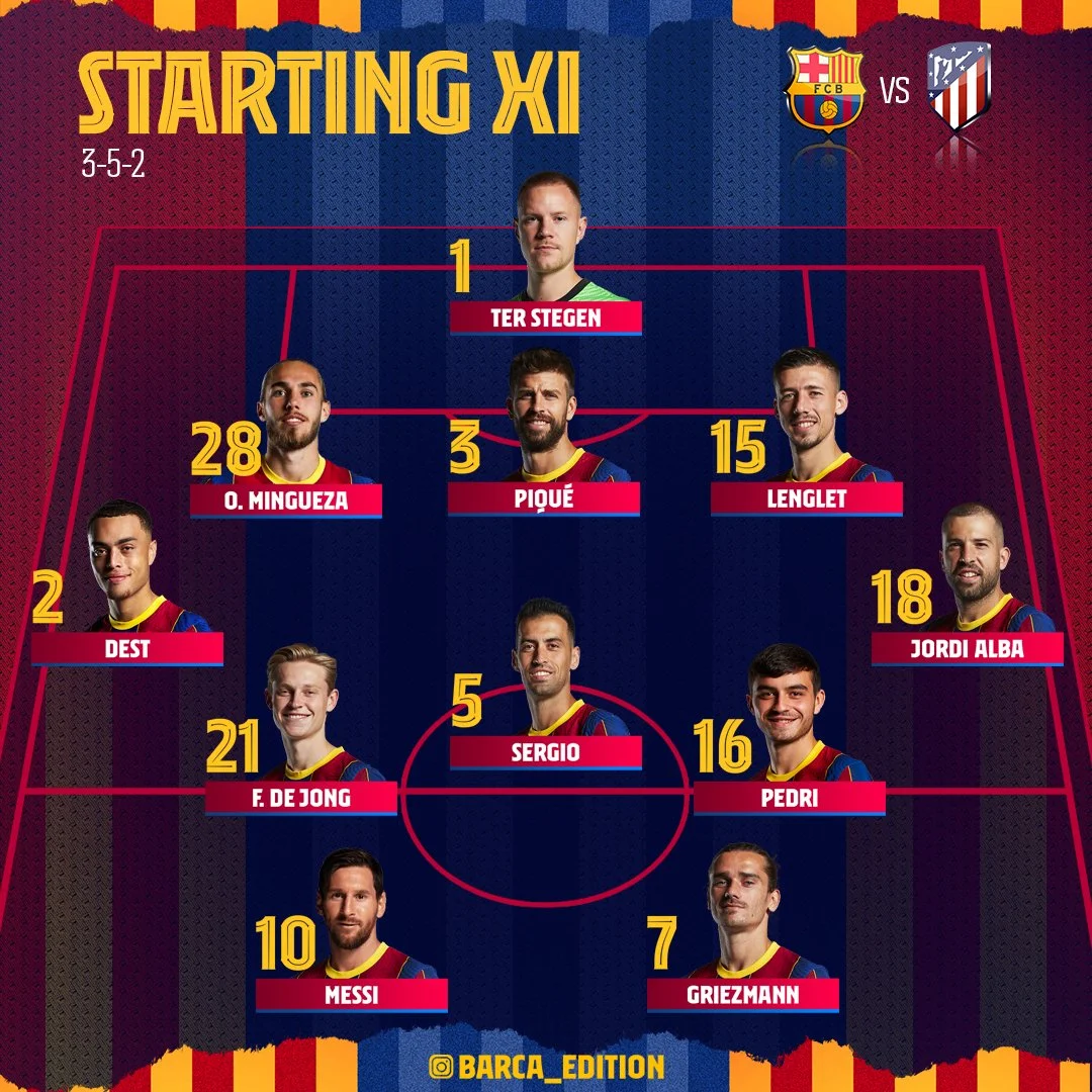 Барселона: Тер Штеген – Дест, Мінгеса, Піке, Лангле, Альба – Де Йонг, Бускетс, Педрі – Мессі, Грізманн