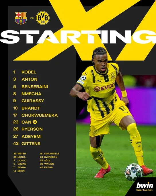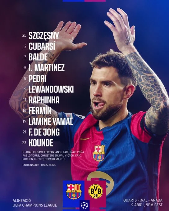 Барселона: Щенсни – Кунде, Мартінес, Кубарсі, Бальде – Педрі, Де Йонг – Ямаль, Фермін Лопес, Рафінья – Лєвандовскі