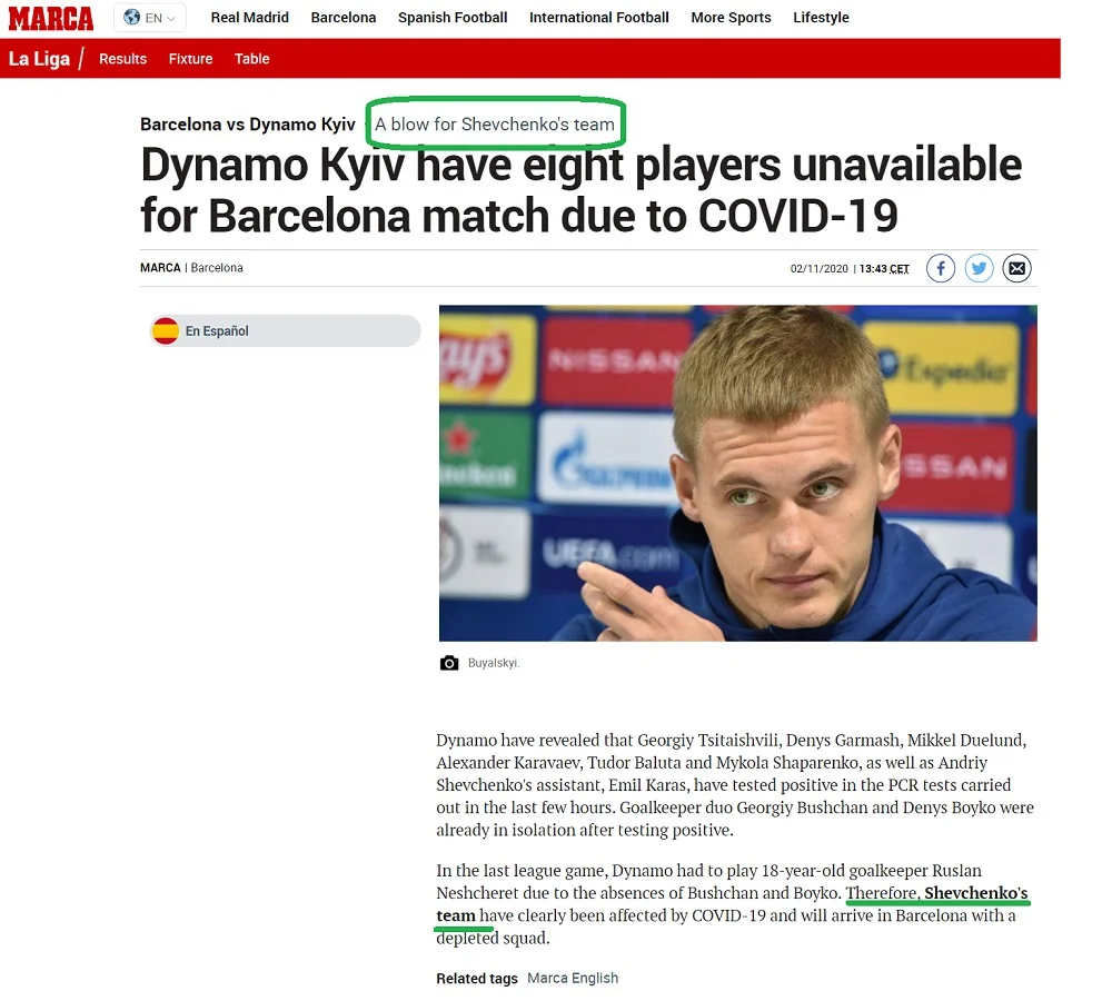 В редакції вважають, що Динамо очолює Андрій Шевченко. Згадка про це фігурує у двох місцях однієї новини. "Удар по команді Шевченка", – такий підзаголовок обрав автор. Вже в самому тексті новини він ще раз нагадує, що "команда Шевченка постраждала від COVID-19 і прибуде в Барселону ослабленим складом".