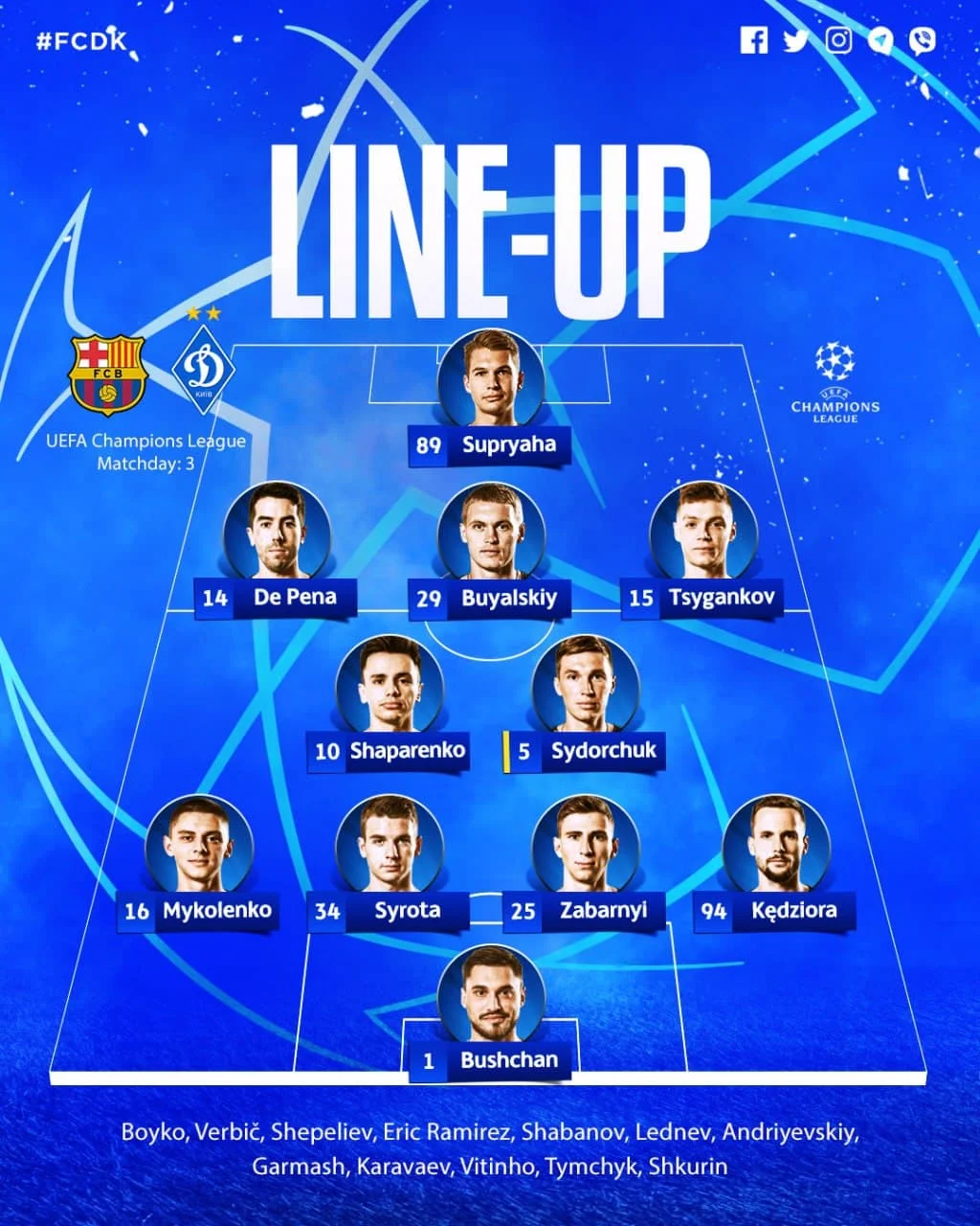 Динамо: Бущан – Кендзьора, Забарний, Сирота, Миколенко – Сидорчук, Шапаренко – Циганков, Буяльський, Де Пена – Супряга