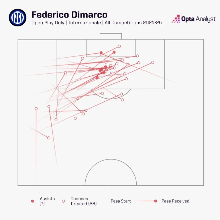 Особливістю "нерадзуррі" є активні вінгбеки, які можуть створили величезні проблеми для Барселони. Той же Дюмфріс не тільки здатний забивати сам – він ще й найкращий у команді за середньою кількістю кросів (3,4 за 90 хвилин). Дімарко ж видає 4,7 кросів, а ще організовує не менше двох топ-моментів за гру. Між тим, у "блаугранас" на лівому фланзі оборони діє юний і вразливий Мартін.