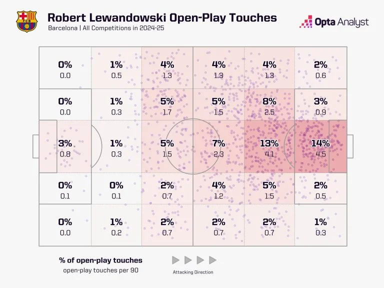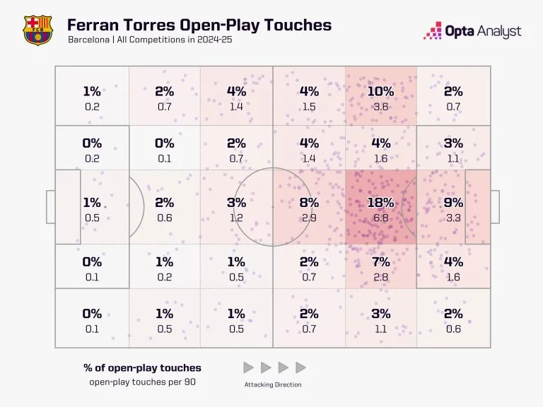 Карта дотиків до м'яча по зонах для Феррана Торреса та Роберта Лєвандовскі. Відсоток показує частку дотиків футболіста від загальнокомандної кількості.