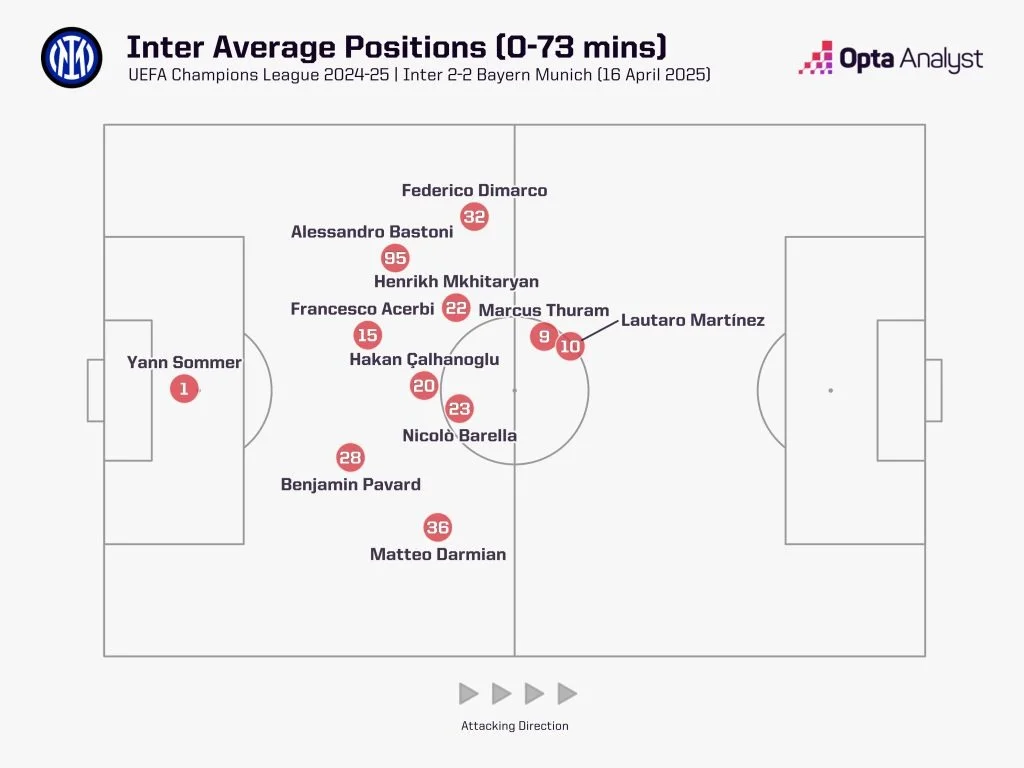 Усереднені позиції гравців Інтера у матчі-відповіді з Баварією. В очі впадає компактність і щільність структури