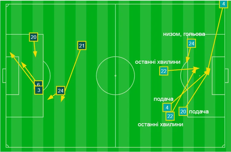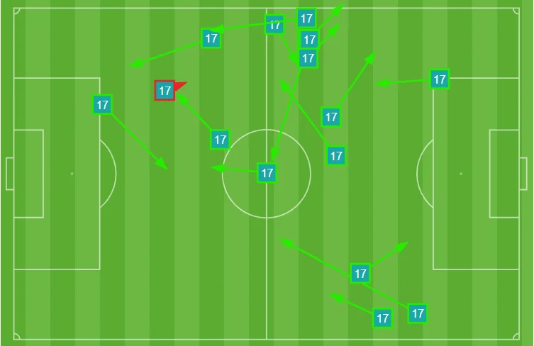 На карті помітно, що француз намагався рухатись між лініями й обігруватися з партнерами, але всі передачі йшли або назад, або на ближнього.