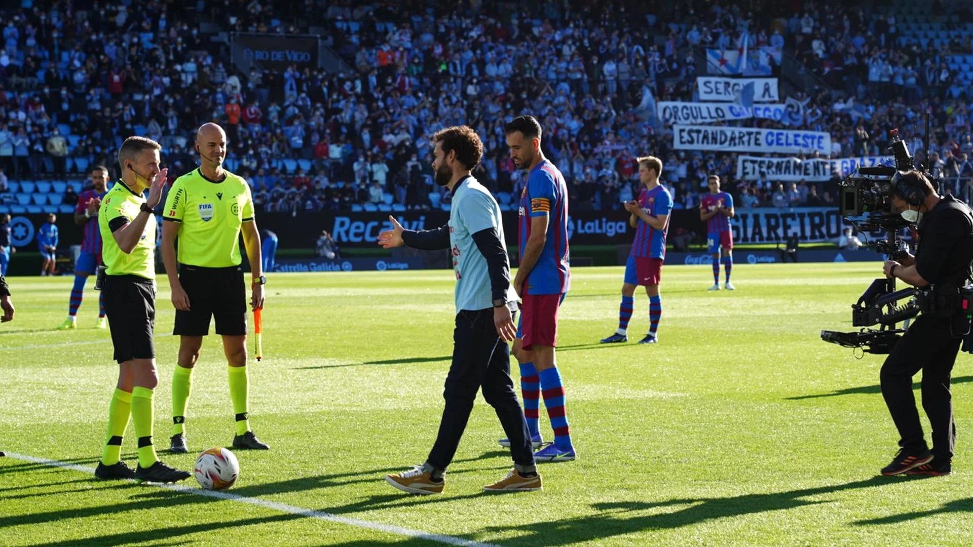 Перед стартовим свистком відбулася зворушлива подія. Кіпер Сельти Серхіо Альварес, який завершив кар'єру через проблеми зі здоров'ям, зробив символічний удар по м'ячу з центра поля. Натомість каталонці вийшли на гру у футболках на підтримку Серхіо Агуеро, який вибув на 3 місяці через проблеми з серцем.
