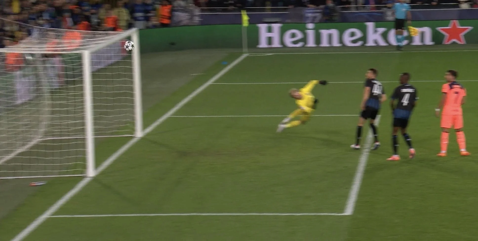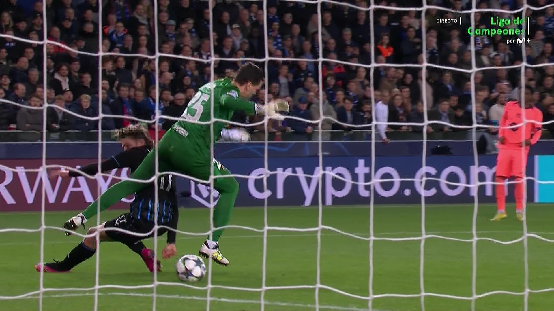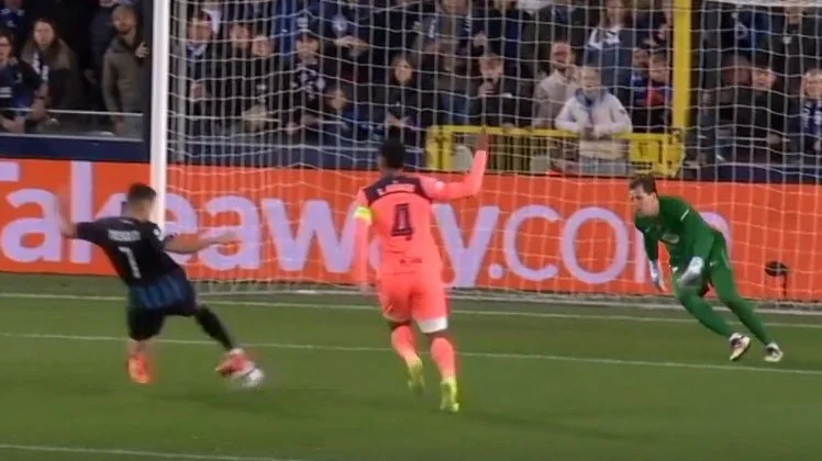 Esta toma es muy clara, roba el balón claramente el jugador del Brujas a Szczęsny.
