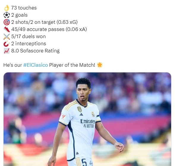 Реал продирається на 1 місце, посуваючи Жирону з Циганковим і Довбиком лише завдяки додатковим показникам (в обох команд по 28 очок). Барселона після Шахтаря в ЛЧ втрачає навіть нічию, відстаючи вже на 4 пункти. Атлетіко залишається тіньовим лідером з шансами набрати все ті ж 28 очок, якщо виграє свої 2 матчі в запасі. Джуд Беллінгем наколотив уже 10 голів (плюс оформив 2 асисти) за перші 10 матчів у Прімері. Найближчий переслідувач у перегонах бомбардирів Грізманн відзначився 7 разів. У третього снайпера іспанського сезону Лєвандовскі 5 забитих. Довбик, Кубо, Хоселу, Майораль, Сарагоса і Мората мають також по 5 голів. Цілих 76 років Класико не знало гравця, який дебютував би у ньому з виїзного дубля!