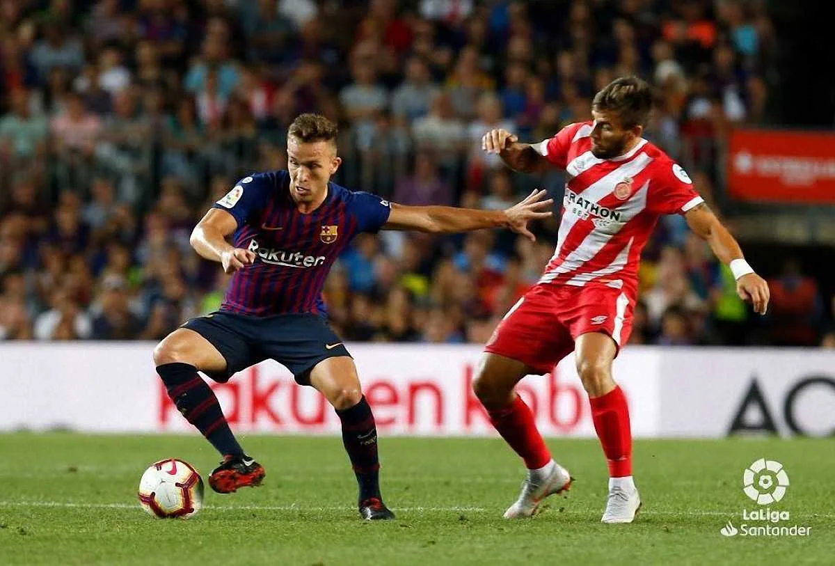 Перший тайм виглядав досить типово для Камп Ноу – Барса ліниво розкатувала м'яч, періодично вмикаючи швидкості та намагаючись загострити, а суперник чекав, коли в їх ворота заб'ють. Правда, перший момент у грі створили саме гравці Жирони: на 5-й хвилині гості заробили кутовий, після якого Еспіноса потужно пробив головою – Тер Штеген парирував. Та й загалом суперник Барси старався бути активним і розривати на швидкості при першій можливості.