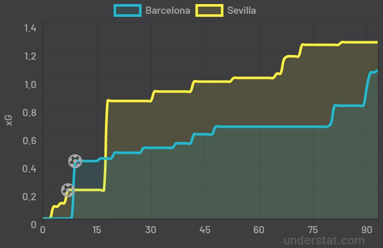 Залишившись з порушеними лініями передач і неспроможністю реалізувати перевагу в швидкості на флангах (у Севільї там грають не менш швидкі виконавці), Барселона здулася вже після 20-ї хвилини. За подальшу годину поєдинку каталонці провели всього п'ять ударів, з яких лише один виявився по-справжньому небезпечним – коли Мессі пробивав повз дальній кут. За цей період гострота господарів склала 0,40 xG. Перший акцентований постріл по воротах Буну в другому таймі взагалі стався аж на 90+1-й хвилині.