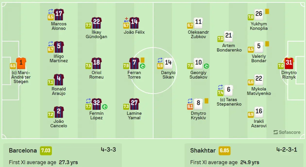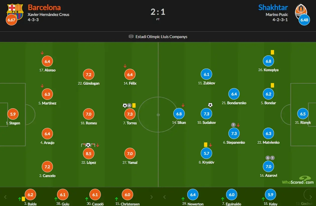 Щодо Барселони, то тут обидва портали були солідарні – найкращим гравцем команди (серед тих, хто провів на полі увесь матч) став Ферран Торрес, набравши 7,9 та 7,3 бали відповідно. WhoScored вище оцінив лише 20-річного Ферміна Лопеса (8,5). А от найгіршим став досвідчений ветеран Марк-Андре тер Штеген – 6,5 від SofaScore і 5,9 від WhoScored.