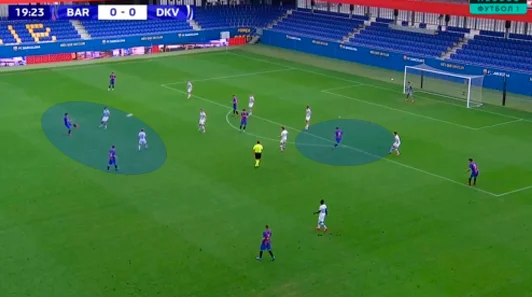 Між тим, опорники не грають з суперником зліва. Фулбек каталонців віддав пас між лініями, а далі опорника киян просто приберуть на дриблінгу. В подібних епізодах каталонці часто ще й вмикали роботу корпусом, прискорюючись і ефектно розвертаючись навколо опонента.
