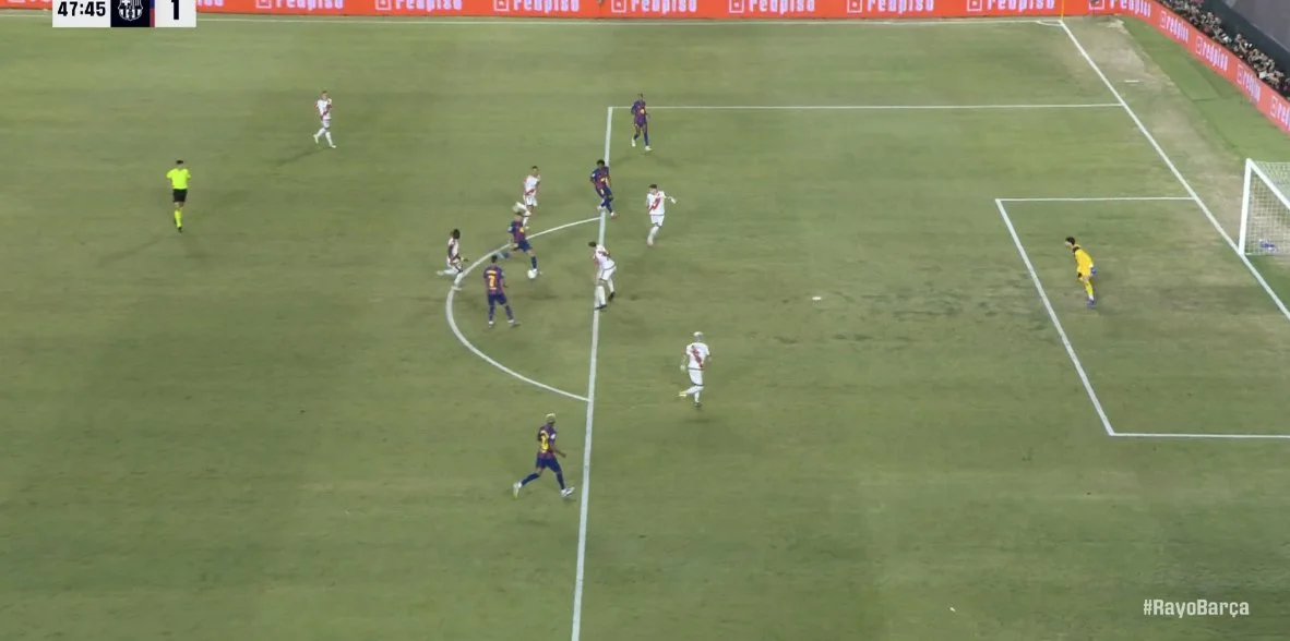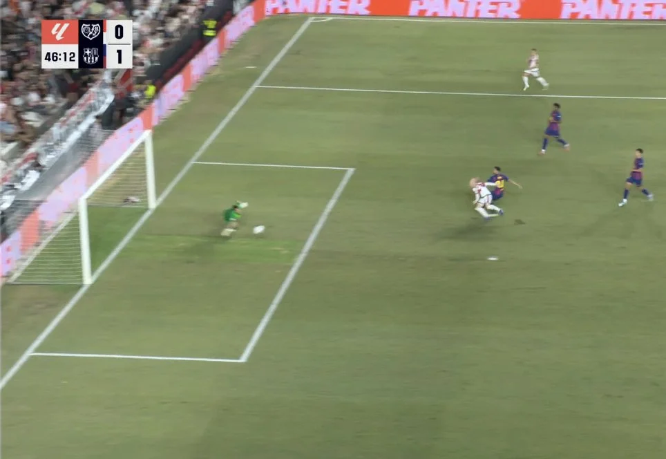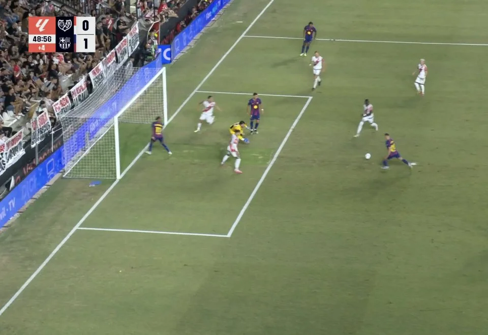 Райо зрівняв рахунок максимально просто. Подача Паласона пішла на дальню стійку, де ніхто не зіграв з Франом Пересом (теоретично його мав прикривати Ямаль). Хавбек же примудрився пробити з лету, та ще й з рикошетом від поперечини – 1:1. По суті, це був невеличкий шедевр.