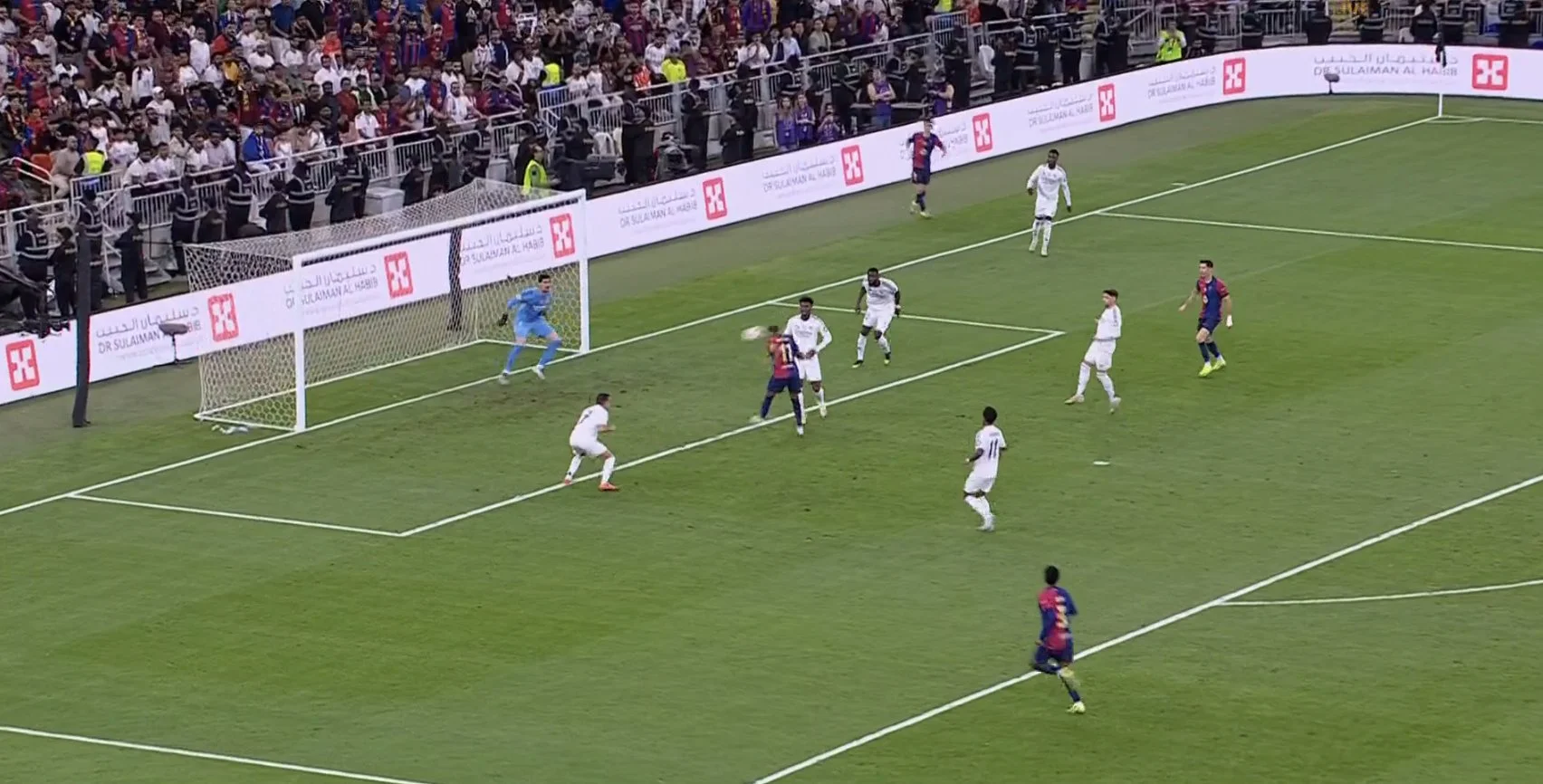 Каталонці могли відкривати рахунок вже на 2-й хвилині внаслідок дальнього удару Ямала, який не без труднощів парирував Куртуа. На 4-й же позначились проблеми, про які йшла мова вище – Васкес повністю провалив гру з Рафіньєю при кросі з правого флангу, дозволивши спокійно пробити головою з 10-ти метрів. Куртуа врятував і тут.