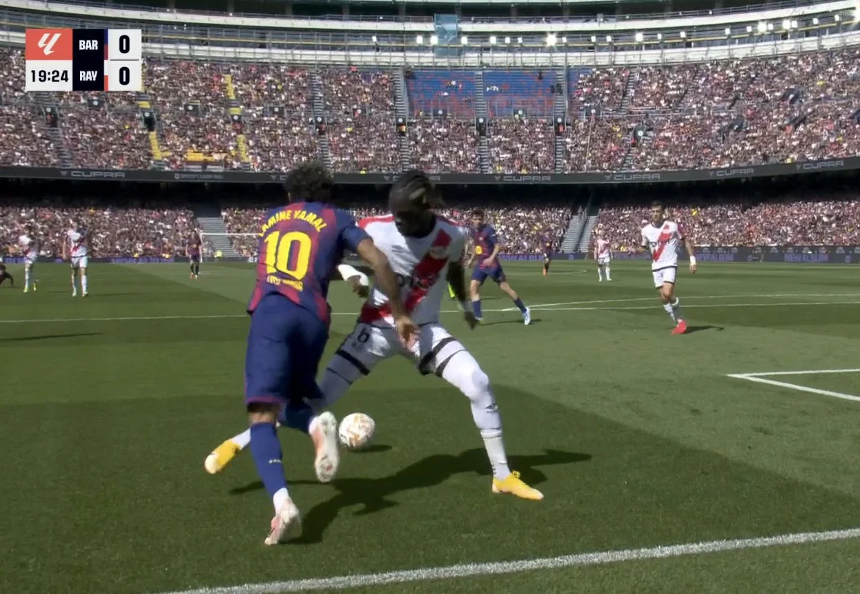 Першу гідну відповідь Барселона провела аж на 13-й хвилині, коли Рафінья скористався обрізкою Сісса й вискочив віч-на-віч – втім, бразилець завершив пострілом повз ліву стійку. На 20-й же Ямаль претендував на пенальті за фол Сісса, однак відеоповтори не дали однозначної відповіді, чи був контакт.