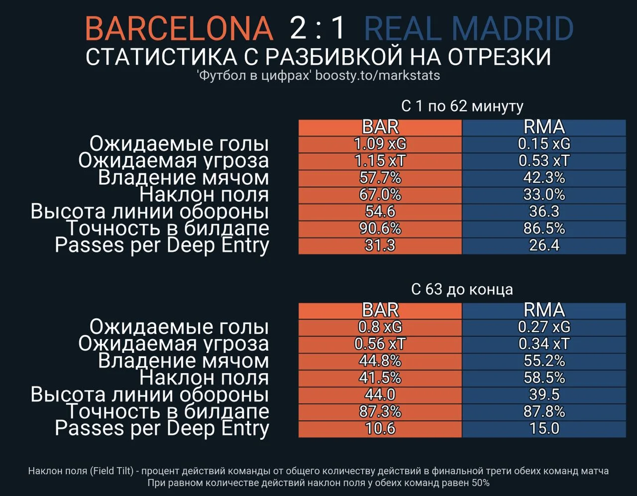 Річ у тому, що Реал, великою мірою, зупинив атаку Барселони. На перший погляд, твердження виглядає абсурдно, адже у каталонців в обох таймах значно вищий xG, а за ударами з меж штрафного 12-4 на їхню користь – втім, диявол криється в деталях. Карло Анчелотті знайшов непогану протидію домінуванню суперника в центрі, опускаючи туди Вальверде (хоча традиційним був хід із опусканням Феде в п'ятірку захисників).