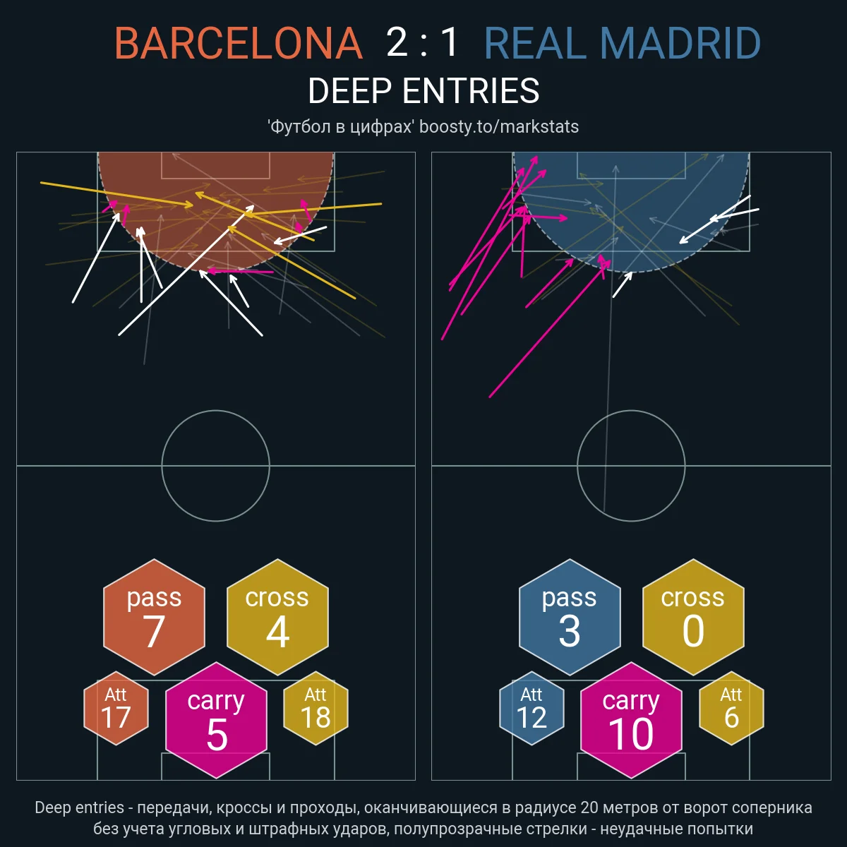 Тим не менш, варто відзначити дві важливих деталі. По-перше, Барселона виглядала різноманітнішою в атакувальному плані. Показовою є статистика просувань м'яча у радіус 20-ти метрів від воріт – каталонці мали і проникні передачі, і кроси з обох флангів, і вривання на дриблінгу. Реал же покладався виключно на ривки Вінісіуса.