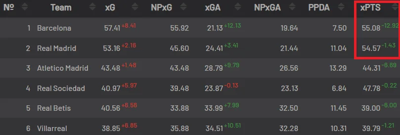 Дана перемога Барселони яскраво відображає загальний хід сезону в Ла Лізі. Барселона і Реал за очікуваними очками йдуть на рівних, однак у реальній таблиці каталонці мають на 13 залікових балів більше. Як так?