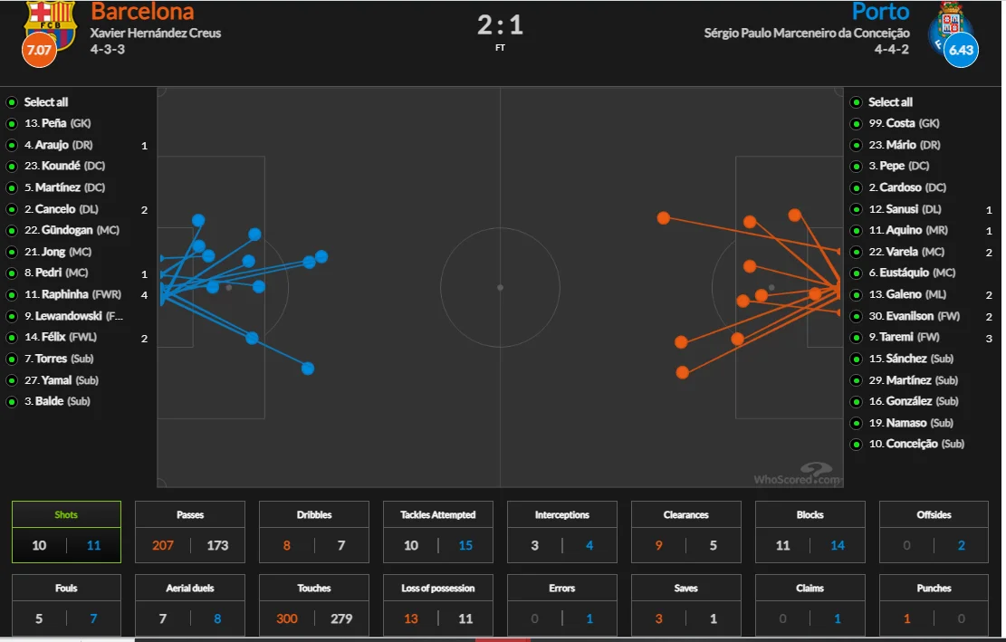 Порту огризнувся кількома контратаками й загалом не сипався. В середині другого тайму гру навіть вдалося вирівняти, однак нічого особливого підопічні Сержіу Консейсау не створювали. Барселона ж не збиралася зупинятись на 2:1, а особливо активним був Рафінья.