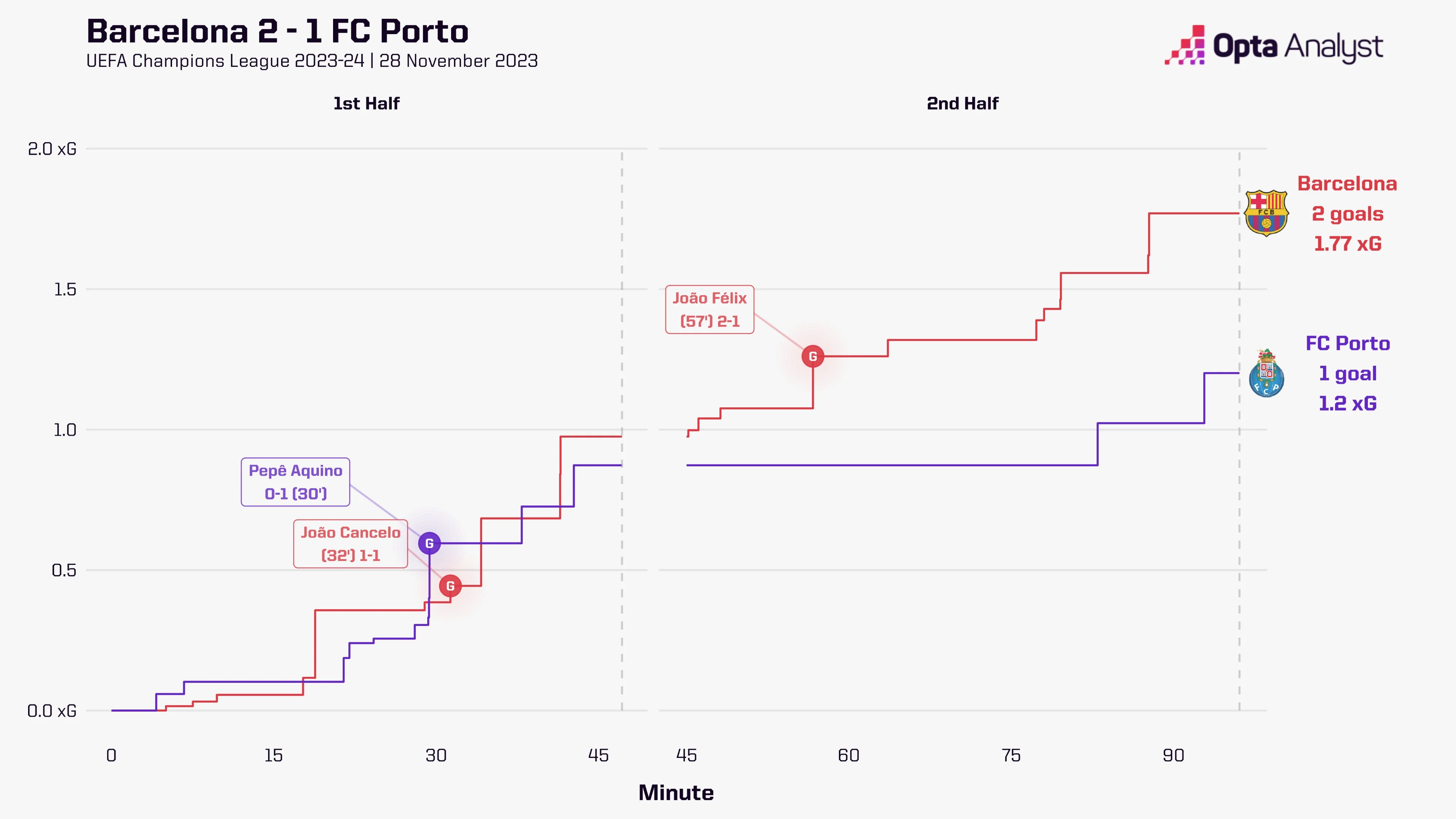 Але щастя Порту тривало недовго. Рівно за дві хвилини Барселона відігралася зусиллями Канселу. Жоау змістився з лівого флангу в штрафний, перегравши кількох захисників та закрутивши м'яч у дальній кут – без шансів для Дієго Кошти. 1:1!