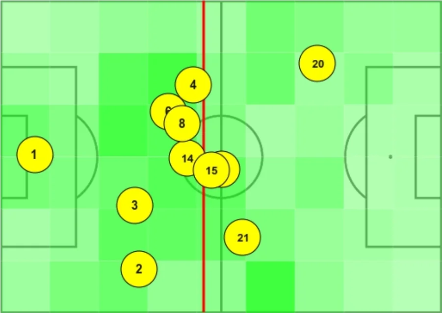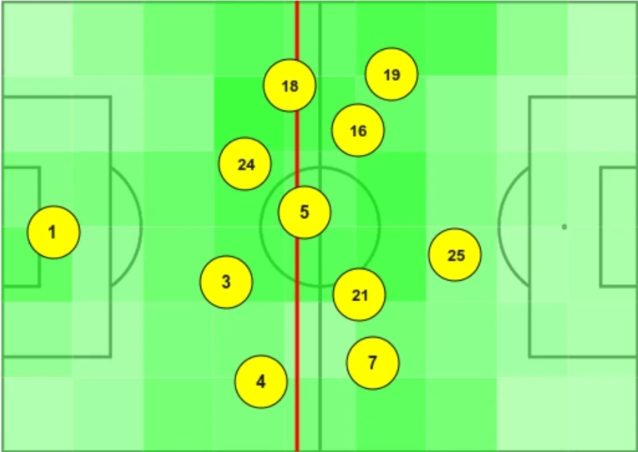 Мапа усереднених позицій каталонців до перших замін виглядає ідеально. За відносно короткий період з Хаві біля керма з’являється тактична грамотність та дисципліна.