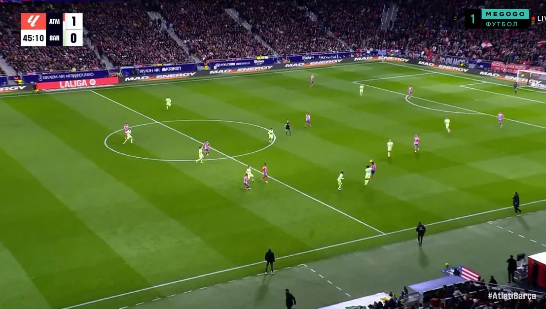 Дієго Сімеоне одразу ж пішов на захист результату, зміцнивши оборону Моліною та Хіменесом. Атлетіко сім у "автобус". Подіяло. Барселона хоч і тримала контроль над м'ячем, але не створювала серйозних моментів у основний час. Тим більш несподіваним став гол Ямала на 1-й компенсованій – Ламін обіграв Галлахера й вгатив з дистанції, а м'яч рикошетом від Рейнілдо пішов у протихід Облаку. 2:3!