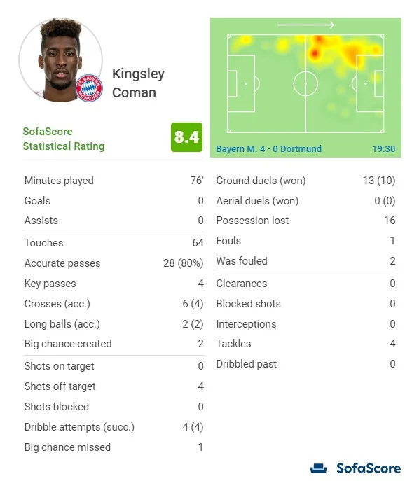 Про Комана також варто сказати пару хороших слів. Борусія зовсім не встигала за маневрами Кінгслі, який був дуже гострим попереду. При цьому француз щоразу відбирав м'яч у суперників, коли повертався на власну половину для допомоги обороні.