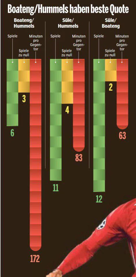 Зв'язка Боатенг-Хуммельс найнадійніша в сезоні для Баварії, якщо орієнтуватися на статистику: 50% "сухих" матчів і аж 172 хвилини на один пропущений гол. При цьому потрібно враховувати, що вибірка для порівняння дуже мала, а інші комбінації центрбеків використовувалися вдвічі частіше. Ніко Ковач перевірив досвідчених захисників разом у грі з Шальке минулого тижня, однак слабкість суперника не дала змоги нормально оцінити їхню роботу.