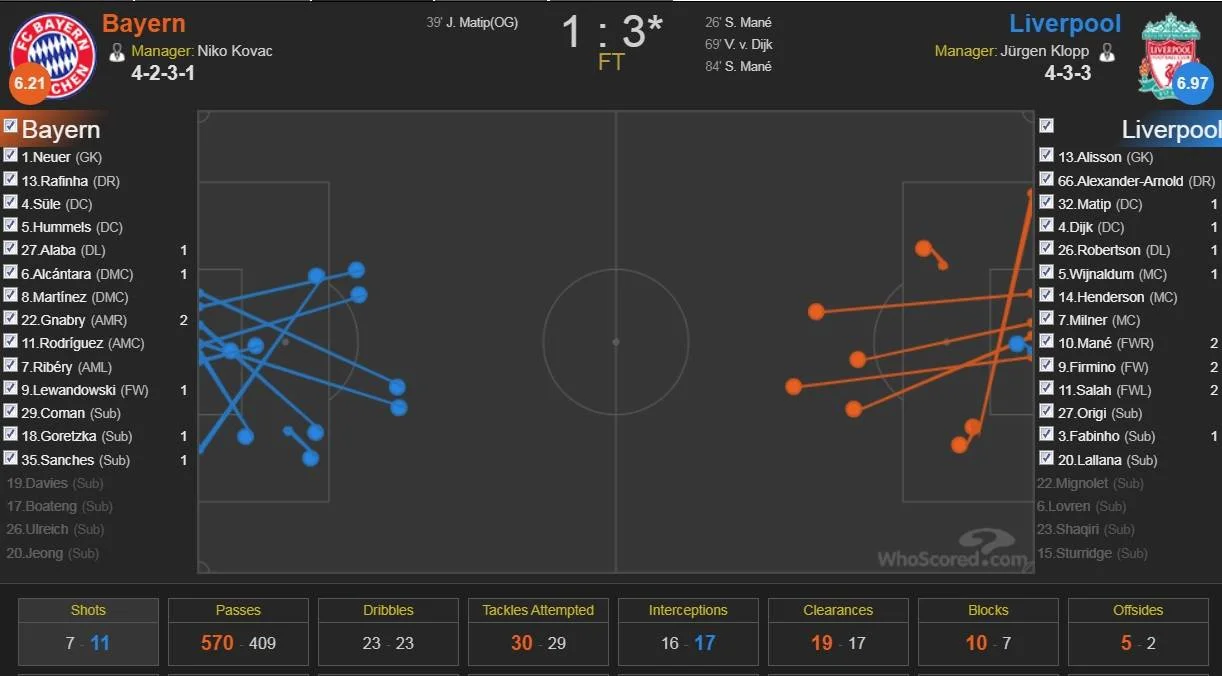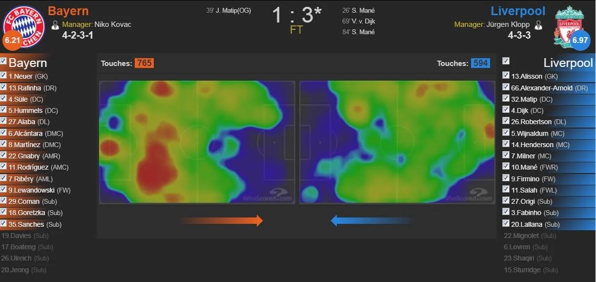 Не менший вплив на гру справила пара центрбеків Матіп – ван Дейк. Повернення останнього очікували особливо, адже наразі він, ймовірно, є найкращим захисником на планеті. Вірджіл вийшов на поле й довів небезпідставність таких оцінок: голландець виконав три перехоплення та п'ять виносів, зняв три верхових м'ячі та виграв чотири з п'яти єдиноборств. Зрештою, він зробив асист та забив головою шикарний м'яч, продемонструвавши всю різницю у нинішній кадровій комплектації Ліверпуля та Баварії. Король повітря повернувся.