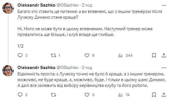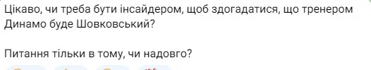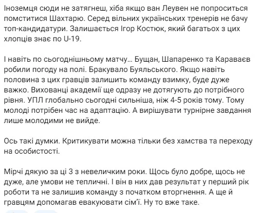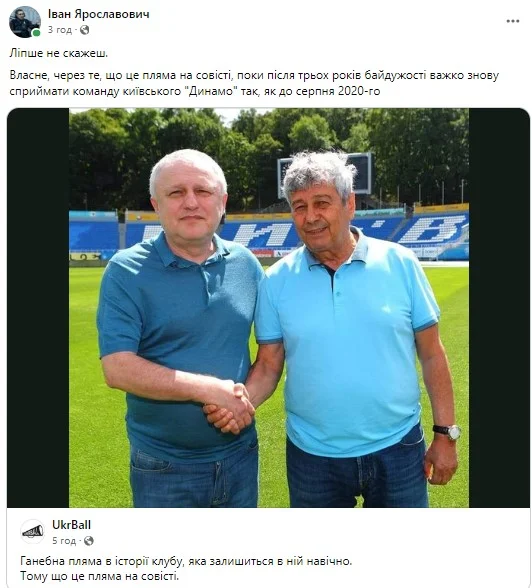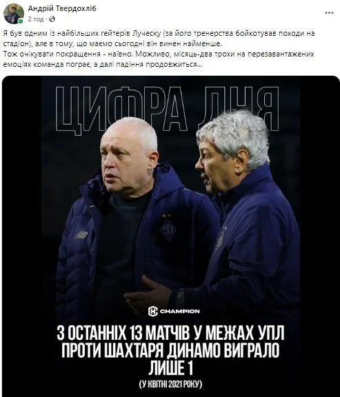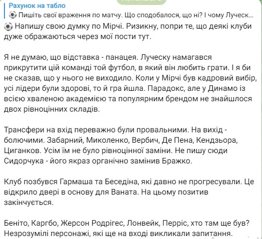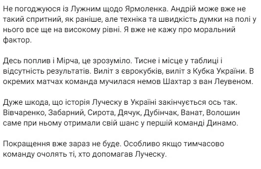 ...і висловлює побоювання щодо "світлого майбутнього" Динамо. Цитуємо: "Я був одним із найбільших гейтерів Луческу (за його тренерства бойкотував походи на стадіон), але в тому, що маємо сьогодні, він винен найменше. Тож очікувати покращення – наївно. Можливо, місяць-два трохи на перезавантажених емоціях команда пограє, а далі падіння продовжиться..."
