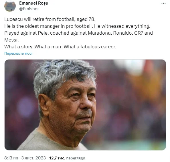 Фінальний акорд – за Емануелем Рошу, румунським спортивним журналістом, який публікувався у World Soccer, FourFourTwo та інших престижних виданнях: "Луческу завершив кар'єру у віці 78 років. Він – найстарший тренер у професіональному футболі. Був свідком усього. Грав проти Пеле, як тренер виступав проти Марадони, Роналдо, Роналду і Мессі. Яка історія. Який чоловік. Яка неймовірна кар'єра".