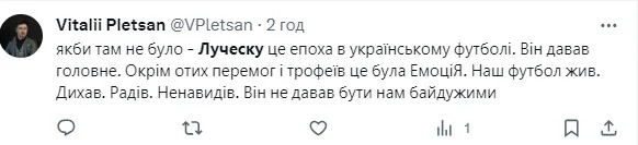 А тепер – до більш теплих відгуків про Луческу. Віталій Плецан, одне з облич колишнього ТК Футбол, переконаний, що "він не давав нам бути байдужими".