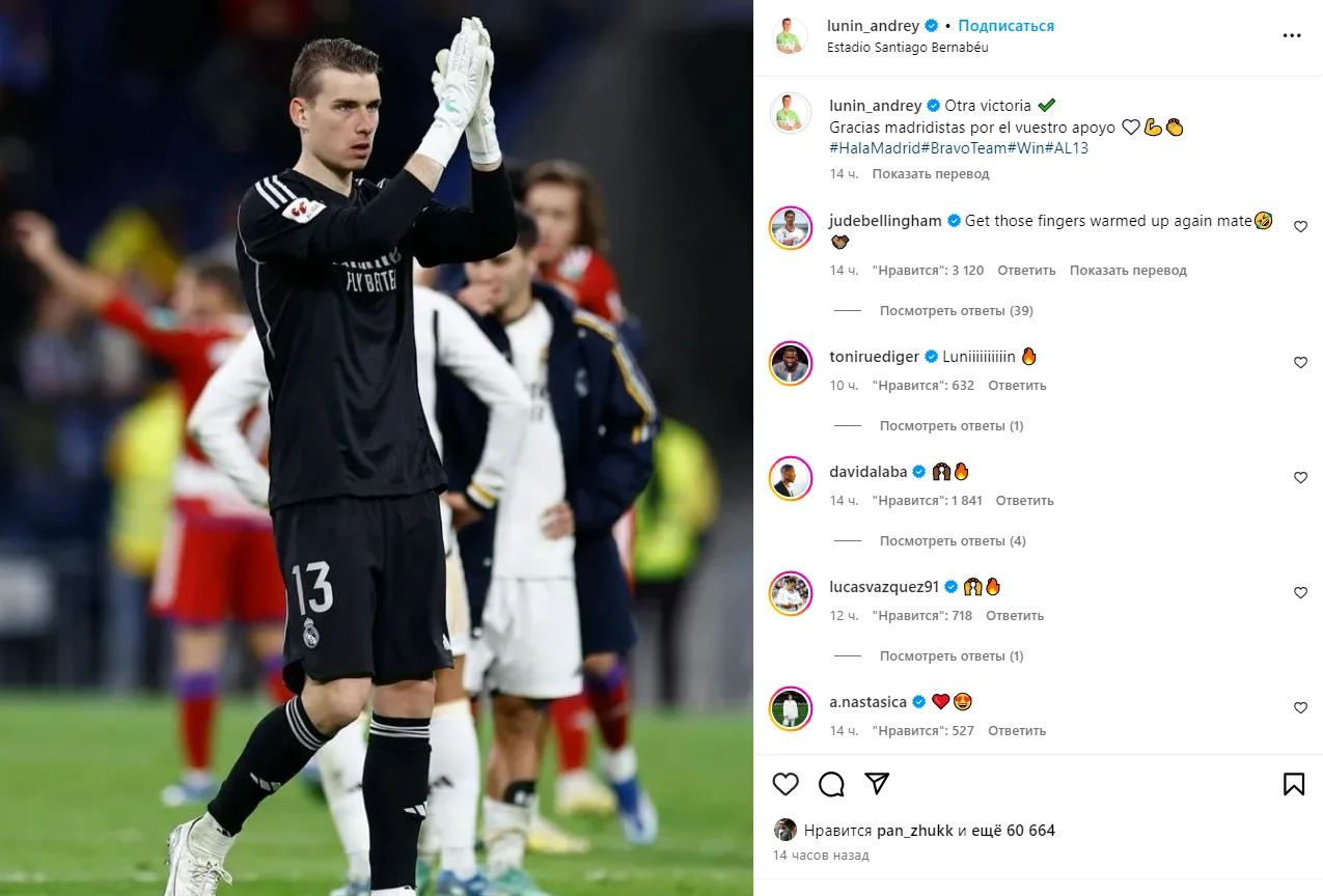 Пост українця прокоментував півзахисник "вершкових" Джуд Беллінгем. У коментарі англієць пожартував: "Знову розігрій пальці, друже". Таким чином він відреагував на післяматчеве інтерв'ю Луніна, в якому той поскаржився на відсутність роботи у грі з Гранадою, заявивши, що у нього "відмерзли пальці".