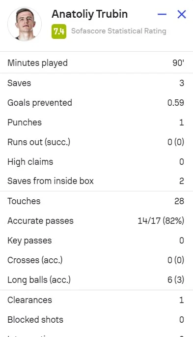 Таким чином, Бенфіка набрала 64 очки та знову очолила турнірну таблицю (у Спортінга на 2 очки менше, але є 2 гри в запасі). Щодо Трубіна, то Sofascore оцінила виступ Анатолія у 7,4 бала. Українець у другій грі поспіль втримав ворота на замку, здійснивши 3 сейви, маючи точність передач 82%.