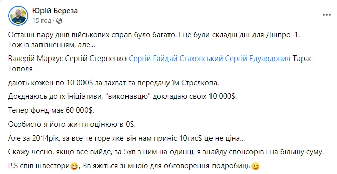 Валерій Маркус, Сергій Стерненко, Сергій Гайдай, Сергій Стаховський і Тарас Тополя дають кожен по 10 тисяч доларів за захоплення та передачу їм Стрелкова. Доєднаюсь до їхньої ініціативи – "виконавцю" докладаю своїх 10 тисяч. Тепер фонд має 60 тисяч доларів.