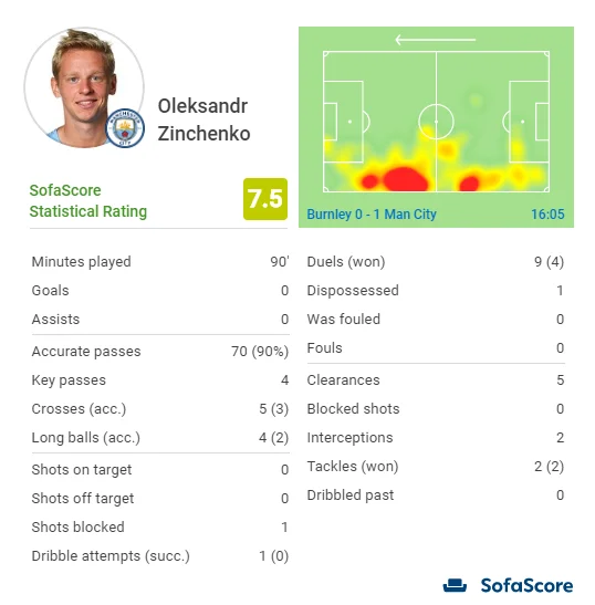 Українець непогано попрацював на атаку (хоча й не вистачало ефективності), та в боротьбі провалювався – один з таких епізодів наприкінці тайму ледь не привів до контрвипаду. Ман Сіті перебив Бернлі (6:1), проте лише 1 влучний удар не дав гостям вагомих підстав для того, щоб вийти вперед. Жалюгідні 0,39 очікуваного гола свідчать, що команда Гвардіоли не награла навіть на 1 забитий м'яч.