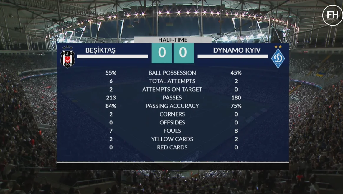 Бешикташ у позиційному наступі виглядав дуже скромно. Мова саме про тактичний малюнок – турки не могли зайти в штрафний і нічого цікавого не вигадували. І це при 63% володіння в перші 25 хвилин. За таких умов їм залишалося тільки кошмарити Динамо лонгшотами та кросами.