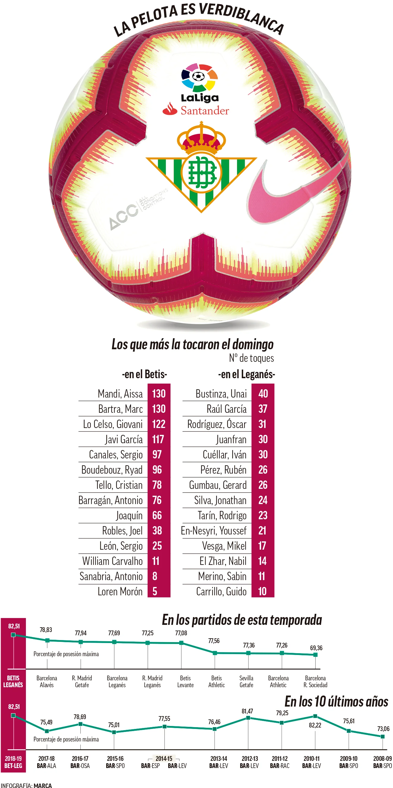 У сезоні 2018/19 лише дві команди топ-5 ліг Європи демонструють краще володіння м'ячем, ніж Бетіс, в середньому за матч – Манчестер Сіті (67,3%) та Барселона (66,2%).