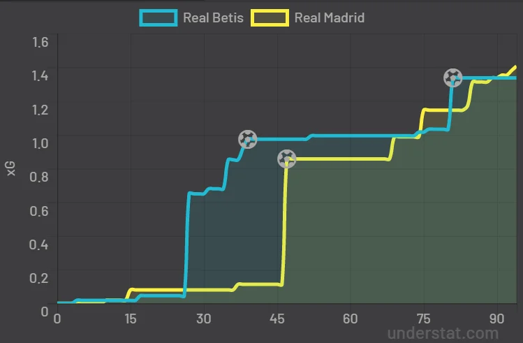 У Реала гра не пішла із самого початку, а в середині першого тайму гості взагалі почали втрачати ініціативу. Фактично, до перерви в актив "бланкос" можна записати тільки удар Вінісіуса на 16-й хвилині та пенальті. В другому таймі аналогічно – один епізод з двома поспіль ударами на 72-й хвилині та фінальний істеричний штурм у компенсований час. Все. Сумарний xG Реала в поєдинку на Беніто Вільямарін склав 1,41 – це навіть більше, ніж у Бетіса, однак 0,74 випадає на пенальті (версія Understat). При цьому, за підрахунками Infogol, до перерви без урахування пенальті "королівський клуб" награв всього на одну десяту голу (0,13 xG).