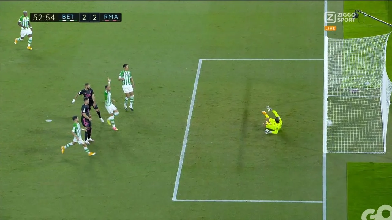 Вже на 20-й хвилині андалусійці провели круту атаку з пострілом Фекіра з лінії штрафного (повз дальній кут), на 24-й Родрігес пробив з дистанції після розіграшу кутового (неточно), а на 26-й Санабрія протиснув Каземіро та завдав удару метрів з 19-ти – над поперечиною! Реал взагалі нічим не відповідав, а Бетіс продовжував нагнітати. Гол назрівав, і, нарешті, "вердібланкос" прорвало. Та ще й як! На 35-й хвилині Бетіс зрівняв рахунок зусиллями Манді, якому вдалося перевисіти Каземіро в повітрі й замкнути блискучу подачу від Каналеса, а ще за дві хвилини потужний удар Карвалью з лівого краю штрафного в ближній кут пролетів під рукою Куртуа – 2:1! Це був "воротарський" гол.