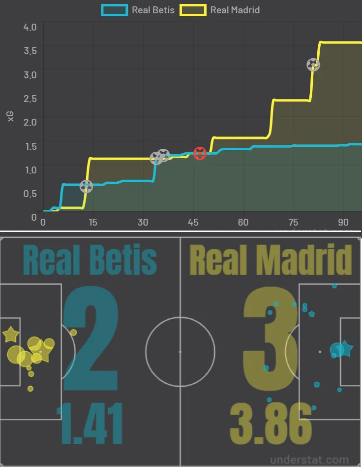 Бетіс статистично виглядав дещо активніше – 15:11 за ударами (5:4 в площину + стійка Реала), 30% матчу пройшло на третині поля гостей. За кількістю успішних єдиноборств мадридці перевершили суперника аж на один переможний епізод, за інтенсивністю пресингу обидві команди не вразили (15,68 vs 10,26 PPDA), за проникними передачами – майже рівність (5:7). Гості значно точніше пасували й виявились вдвічі гострішими, але половина від їхнього сумарного xG припала на пенальті та два моменти після нього.