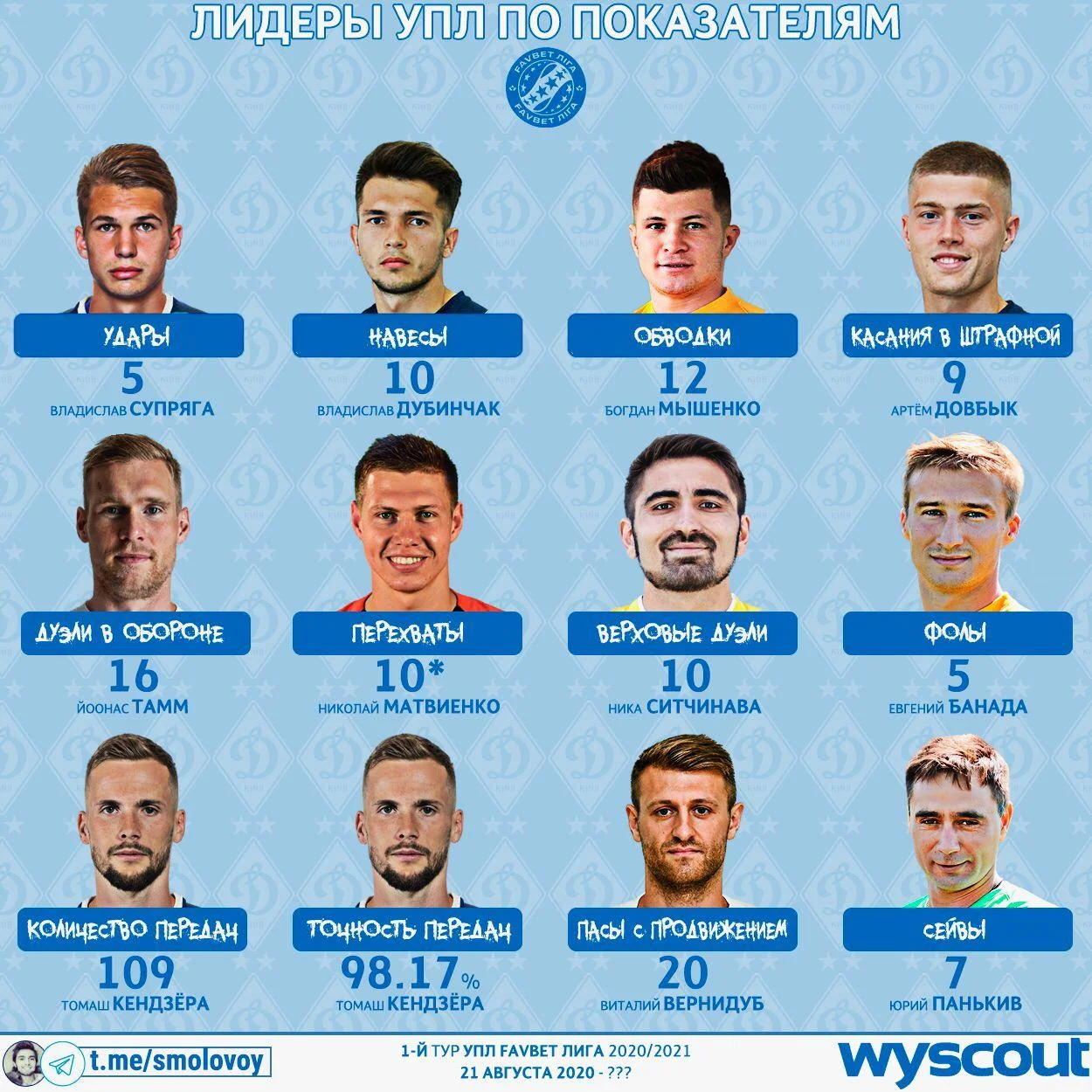 Стартував новий сезон української Прем'єр-ліги. У першому турі відбулося 6 матчів – поєдинок Львова та Миная перенесли через коронавірус. Виділяємо лідерів за деякими важливими показниками.