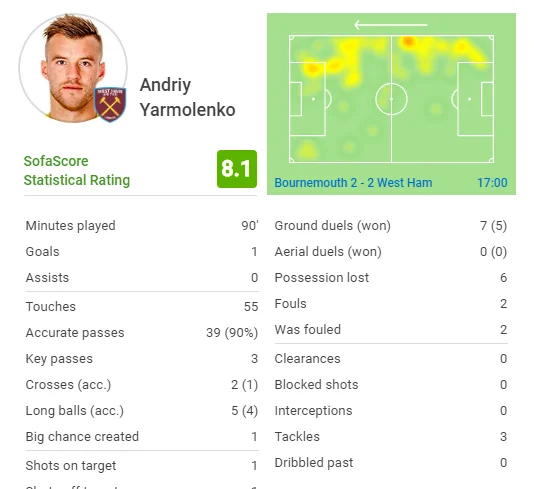 Як і в переможному матчі проти МЮ тиждень тому, сьогодні знову забили Ярмоленко і Кресвелл. Андрій перевершив самого себе з минулого тижня і став третім найкращим у ВХЮ за відборами (3), точністю пасу (90%) і створеними гольовими моментами (3), не виграв лише 2 єдиноборства з 7 і поступився тільки Фредеріксу в якості дальніх передач (4 з 5 знайшли адресат). При цьому відіграв дуже чисто – лише 6 втрат володіння. Такого Андрія дуже не вистачало Пеллегріні в попередньому сезоні. Екс-наставник Реала відзначив це після матчу: "Ярмоленко не втрачає жодного м'яча і завжди працює дуже важко".