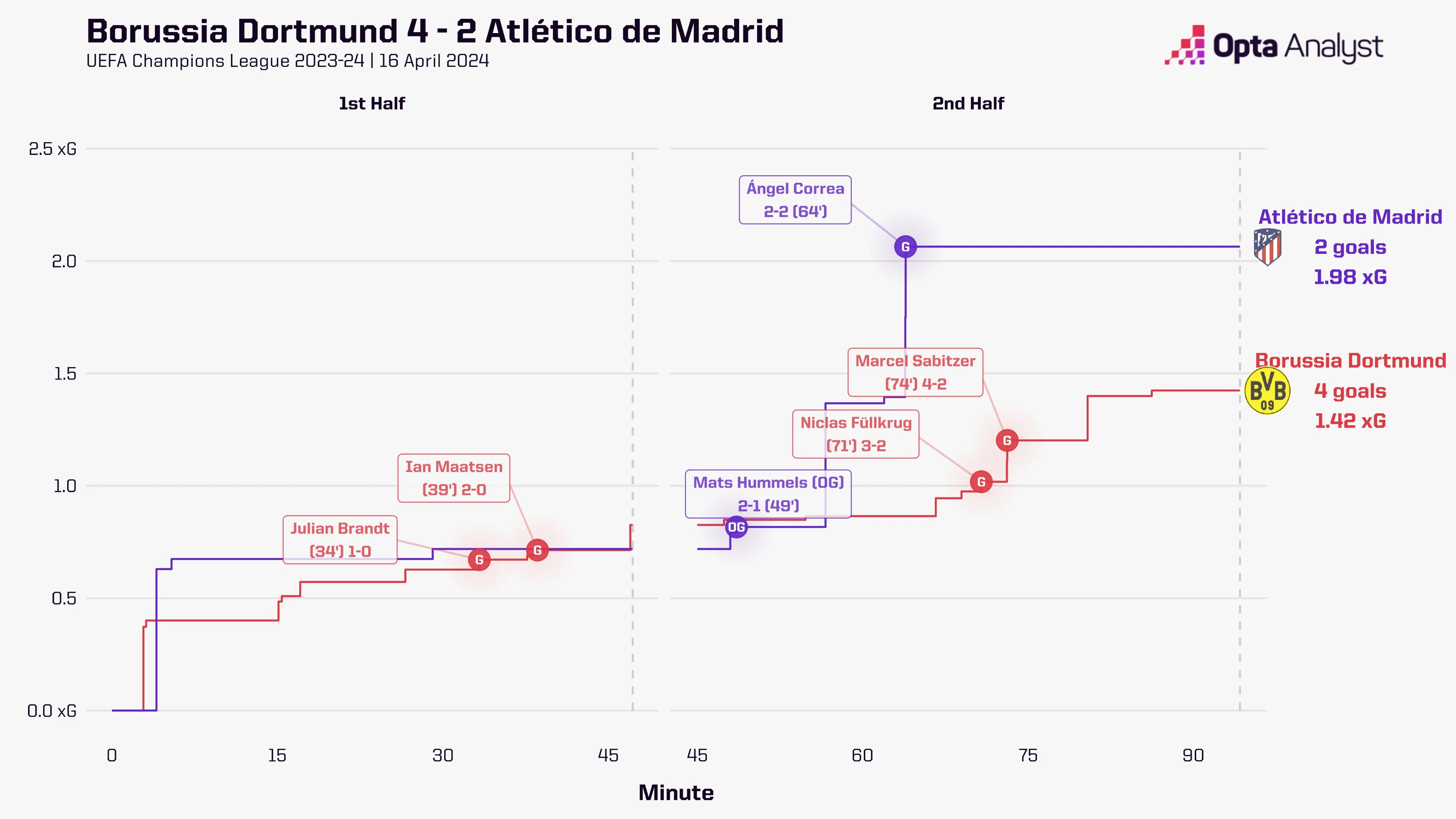 Він і відкрив рахунок у зустрічі: отримав геніальний пас від Хуммельса та пробив з гострого кута. До другого та третього голів 19-й номер також долучився. Головні ролі там зіграли Забітцер, Маатсен і Фюлькруг, однак Брандт дезорієнтував Атлетіко швидким вкиданням ауту (перед другим) і крутим пасом у розріз (перед третім).
