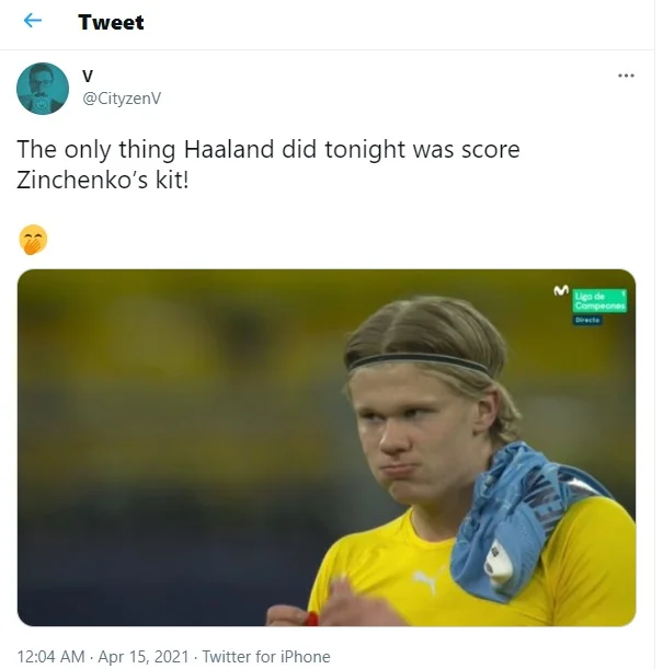 "Єдине, що зробив сьогодні Холанд – "забив" футболку Зінченка", – жартують у соцмережах. Зауважимо, що Манчестер Сіті став першою командою Ліги чемпіонів, ворота якої 20-річний норвежець так і не зумів вразити за останні два сезони – з моменту дебюту Холанда в турнірі.