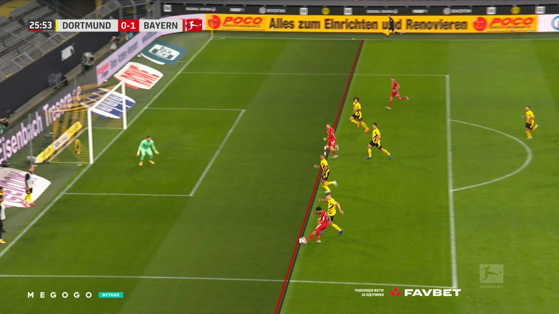 Однак дортмундці не втримали переможний рахунок навіть до перерви. У компенсований час Баварія заробила небезпечний штрафний і дуже хитро його розіграла. Лєвандовскі пробіг, Гнабрі ткнув на Мюллєра, а Томас зупинив м'яч для удару Алаби. Господарі були розгублені, тому Девіду не склало труднощів загнати м'яч у сітку.